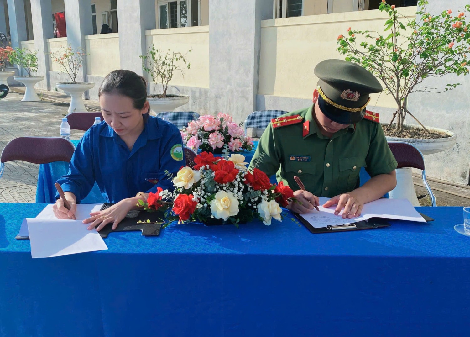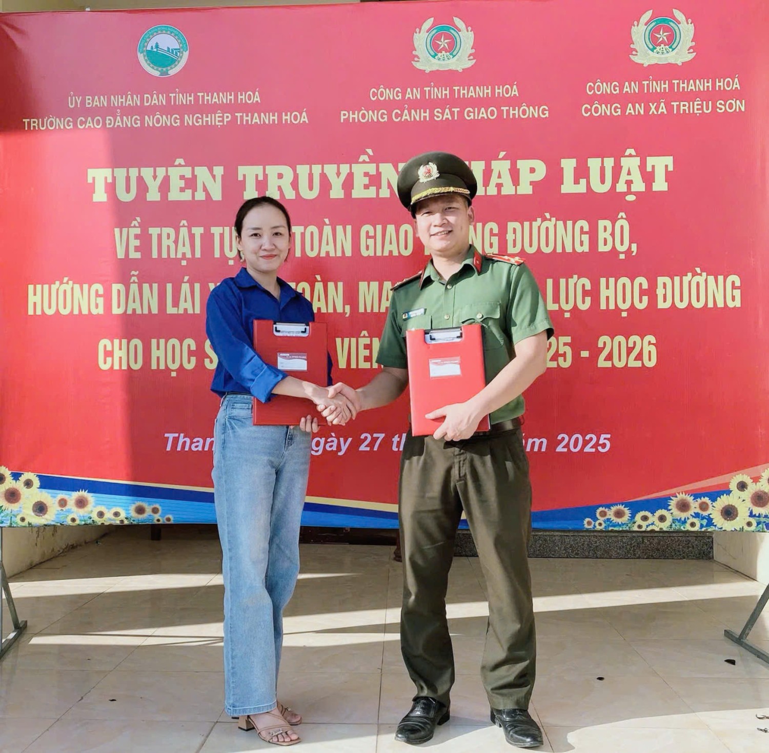 Để truyền tải thông điệp tích cực, buổi hoạt động ngoại khoá đã kết thúc trong không khí hào hứng, sôi nổi bằng biên bản cam kết phối hợp giữa Đoàn thanh niên Trường Cao đẳng Nông nghiệp Thanh Hóa và Đoàn thanh niên công an xã Triệu Sơn với mô hình “Cổng trường an toàn giao thông”