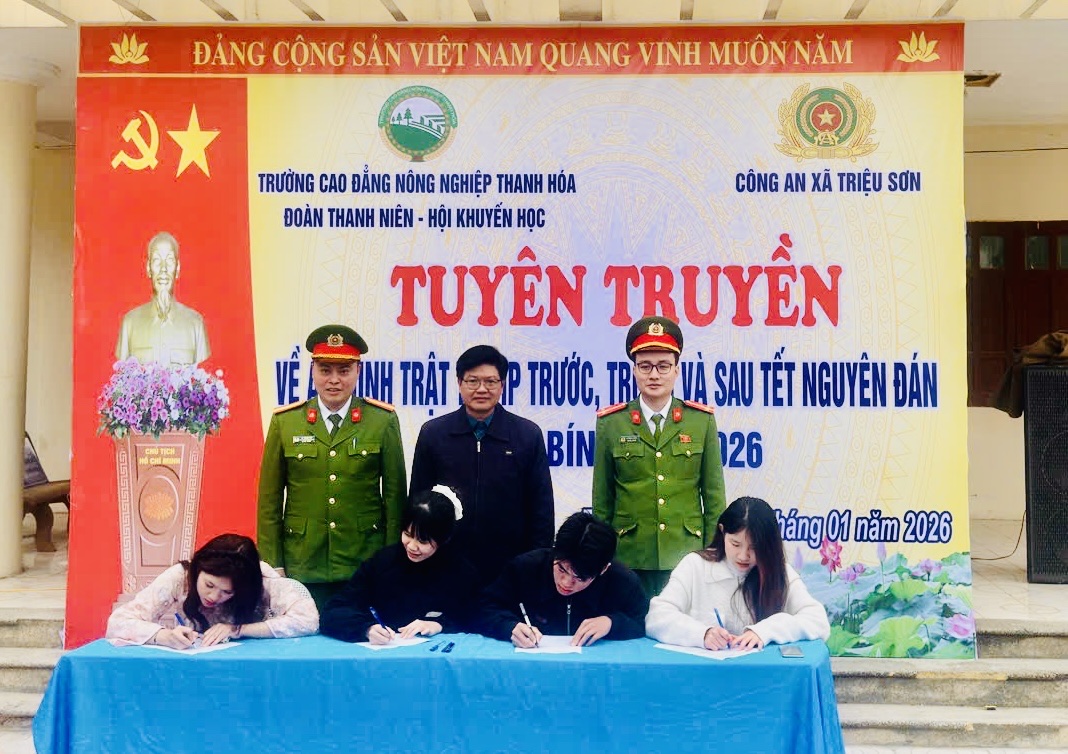 Nhân dịp này, Công an xã Triệu Sơn đã tổ chức tuyên truyền về an toàn giao thông, an ninh trật tự trước, trong và sau dịp Tết Nguyên đán Bính Ngọ 2026; Tại chương trình, đại diện học sinh, sinh viên nhà trường tham gia ký cam kết chấp hành pháp luật, góp phần bảo đảm an ninh, trật tự và an toàn xã hội trong dịp Tết.