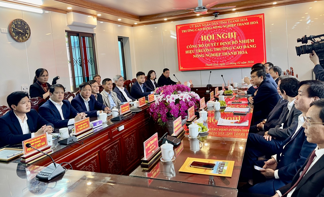 Tại Hội nghị, đồng chí Hoàng Ngọc Trung đã công bố Quyết định số 469/QĐ-UBND ngày 07/02/2026 của Chủ tịch UBND tỉnh Thanh Hóa về việc điều động và bổ nhiệm PGS.TS Lê Viết Báu, Bí thư đảng uỷ, nguyên Chủ tịch Hội đồng trường Trường Đại học Hồng Đức, giữ chức vụ Hiệu trưởng Trường Cao đẳng Nông nghiệp Thanh Hóa. Quyết định có thời hạn 05 năm kể từ ngày ký.