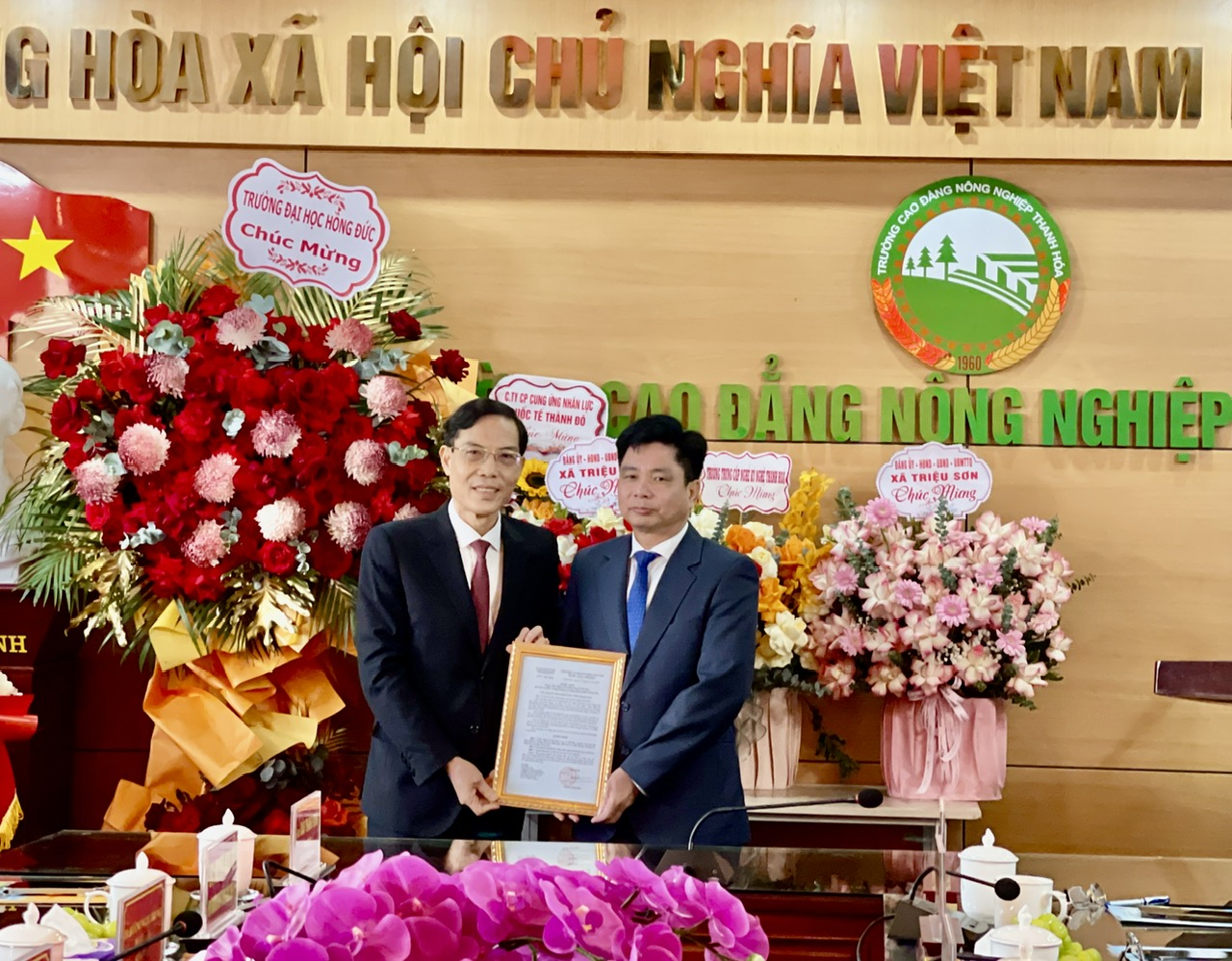 Đồng chí Đầu Thanh Tùng, Tỉnh ủy viên, Phó Chủ tịch UBND tỉnh Thanh Hóa trao Quyết định bổ nhiệm Hiệu trưởng trường cao đẳng Nông nghiệp Thanh Hóa cho PGS.TS Lê Viết Báu