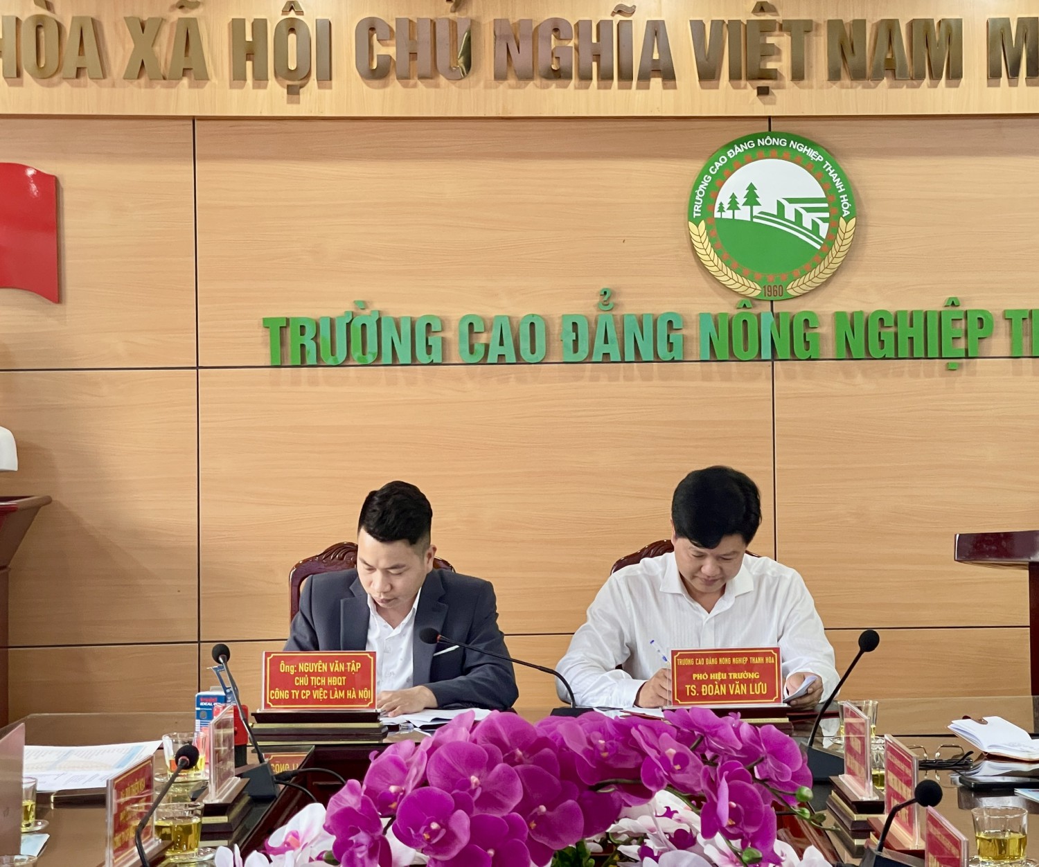 TS. Đoàn Văn Lưu – Phó Hiệu trưởng trường Cao đẳng Nông nghiệp Thanh Hóa và Ông Nguyễn Văn Tập – CTHĐQT Công ty Cổ phần Việc làm Hà Nội ký kết triển khai các nội dung hợp tác đào tạo theo hợp đồng.
