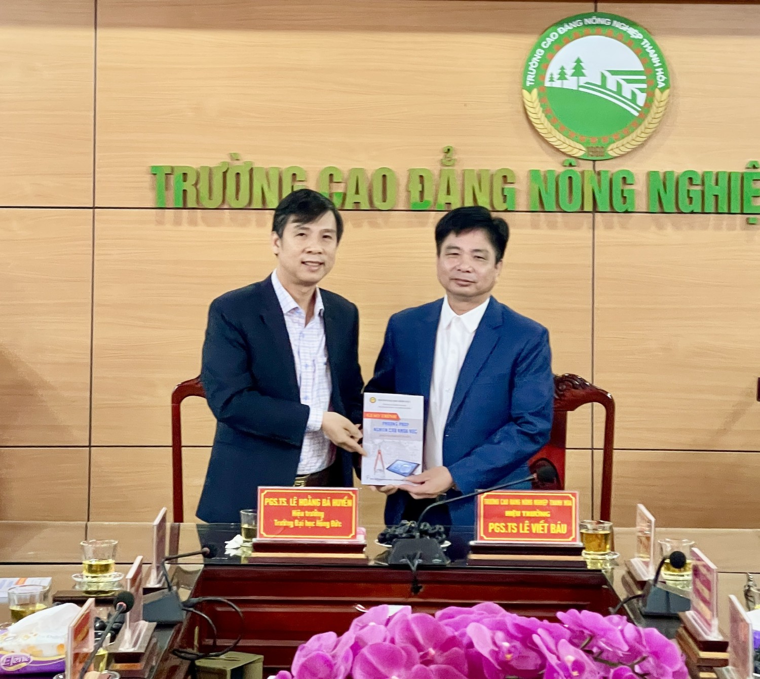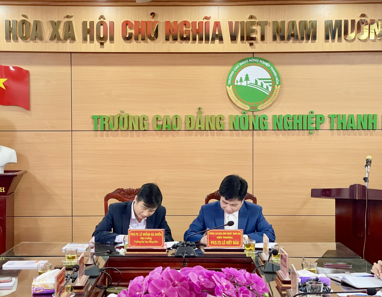 PGS.TS Lê Hoằng Bá Huyền và PGS.TS Lê Viết Báu ký kết biên bản bàn giao Trường Cao đẳng Nông nghiệp Thanh Hoá