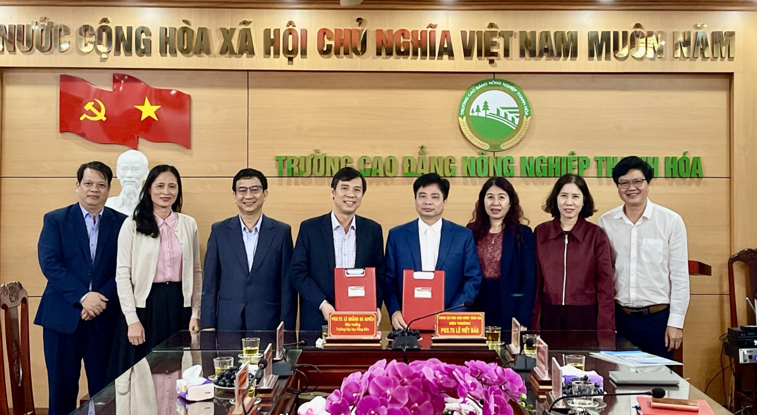 Ban Giám Hiệu trường Đại học Hồng Đức và trường Cao đẳng Nông nghiệp Thanh Hóa chụp ảnh lưu niệm.