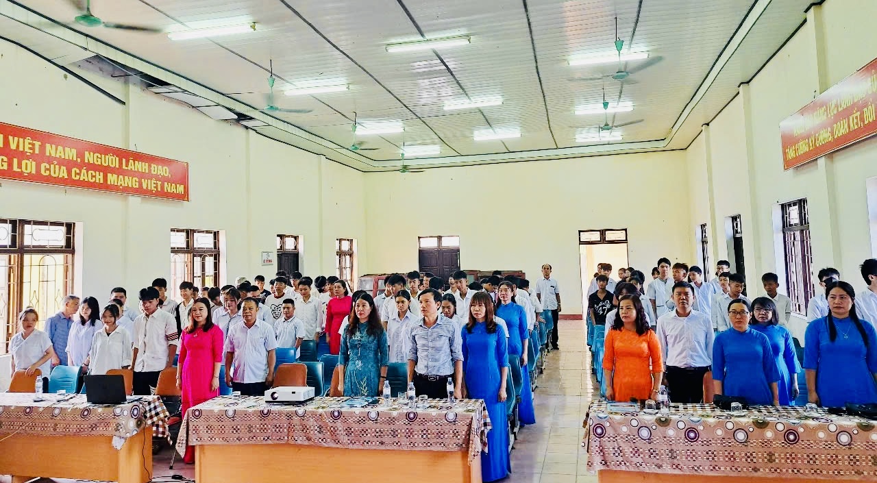 Các cán bộ lãnh đạo, thầy, cô giáo và các em học sinh tại cơ sở đào tạo làm Lễ chào cờ trong buổi Lễ khai giảng.