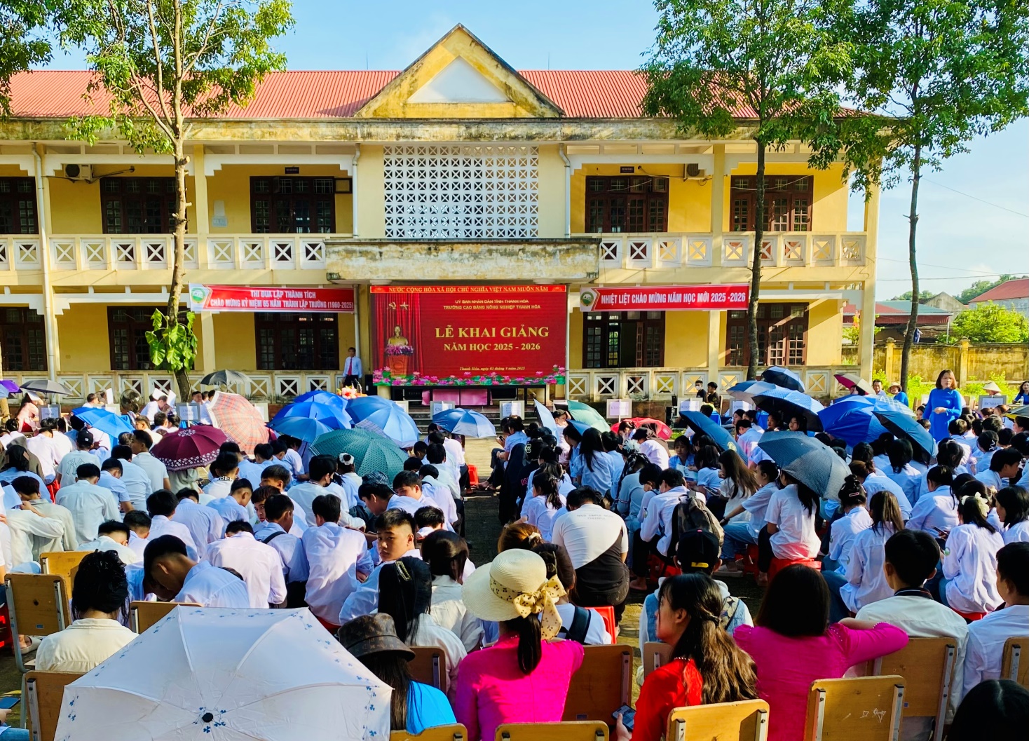 Trong không khí trang nghiêm, nhiều cảm xúc, thầy trò trường Cao đẳng Nông nghiệp Thanh Hóa đã nghe bài phát biểu của Tổng Bí thư Tô Lâm chúc mừng 80 năm truyền thống ngành Giáo dục và khai giảng năm học mới. Bộ trưởng Nguyễn Kim Sơn đọc diễn văn kỷ niệm, đại diện học sinh, sinh viên cả nước phát biểu. Lãnh đạo Đảng, Nhà nước cũng trao tặng Huân chương Lao động hạng Nhất cho Bộ GD&ĐT, đánh trống khai giảng năm học 2025 – 2026. Mong rằng các thế hệ học sinh, sinh viên sẽ cống hiến sức trẻ, tài năng và tâm huyết của mình cho Đất nước, rèn đức luyện tài để đưa Việt Nam trở thành con rồng của Châu Á, “sánh vai với các cường quốc, năm châu” đúng như lời căn dặn của Chủ tịch Hồ Chí Minh đã gửi gắm cho các cháu học sinh, sinh viên trong ngày khai trường đầu tiên.